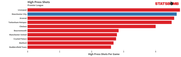 By design, this sort of distribution welcomes the high press. Teams that park the bus can be hard to break down in the final third. Manchester City hopes that opposing teams will take the bait and press these short lateral passes in their own third, trusting that the talent in their squad will allow them to comfortably play through stretched opposition. Please remember that I’m only the messenger when I tell you that it pretty much always works.