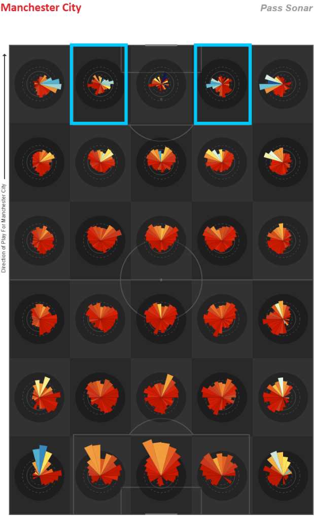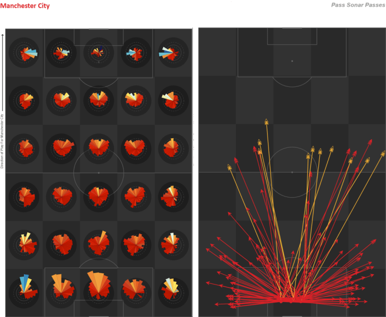 By contrast, Manchester City will do almost anything NOT to play a long pass. Below, the sonar shard map (!!) on the left shows the length, direction and quality of the passes Man City make in each zone. It should come as no surprise that they have no qualms playing the ball in any direction from any spot on the field, a tactic that makes them especially tough to defend. The map on the right shows their distribution from the keeper position. His job is essentially to get the ball into play as quickly as possible, with no mandate to move the ball forward.